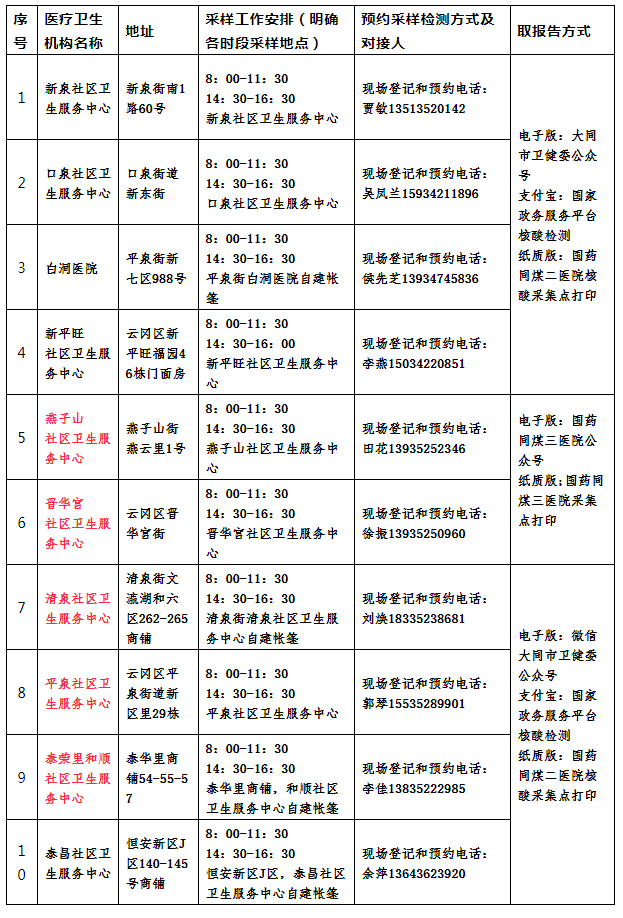 为积极配合山西省卫生健康委推进新冠病毒核酸检测能力建设,全力满足社会“应检尽检、愿检尽检”需求,国药同煤(大同)医疗健康产业有限公司按照省、市卫健委疫情防控工作部署安排,决定增加新泉社区卫生服务中心、口泉社区卫生服务中心等10处核酸检测采样点,用于新型冠状病毒核酸检测,旨在加快新冠病毒核酸检测工作进度,提高新冠病毒核酸检测工作效率,满足广大居民群众核酸检测的需求,请大家依据自身实际自行选择周边核酸检测点,就近进行检测,以减少人员聚集和排队等候时间,现将核酸检测点具体信息发布如下: